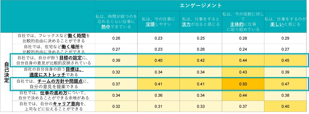 下記の表は、株式会社NEWONEが、618名のビジネスパーソンに対して調べたエンゲージメント向上に何が相関するのかというデータ結果ですが、働く時間や場所を自己決定できるよりも、担う目標設定に関与できる、チームの方針や問題点に意見が言える、という行動の方が、相関係数が高い結果となっています。