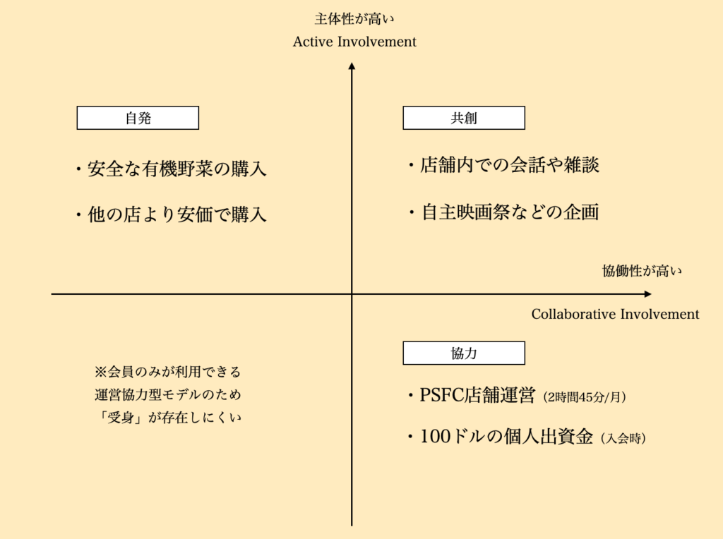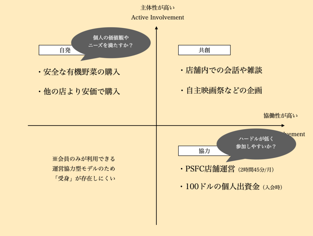 また店舗運営に入るタイミングで、会員同士で料理のレシピ交換、お互いの家事のサポート相談、共通の関心がある自主映画祭の企画など、自然発生的に会員同士の共創的な活動(図の右上)が生まれることで、コミュニティへの帰属意識や参画意識が高まり、自然と友人にPSFCを紹介していくような流れが生まれてきたと言われています。