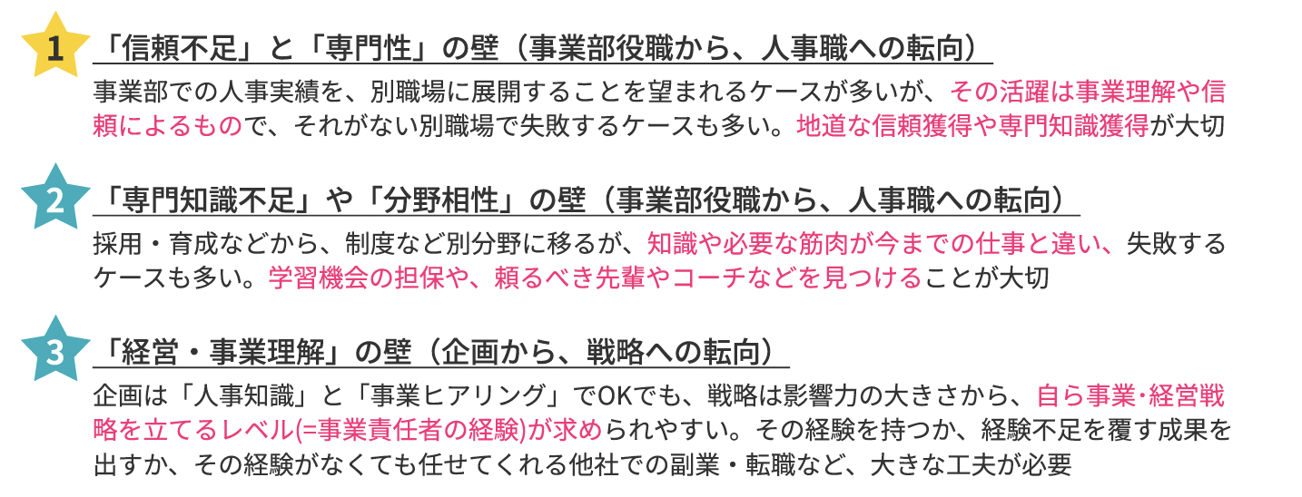 特に「役割ごとに求められる経歴」「よくあるキャリアの壁」多くの人事の方のキャリアの指標になると思います。