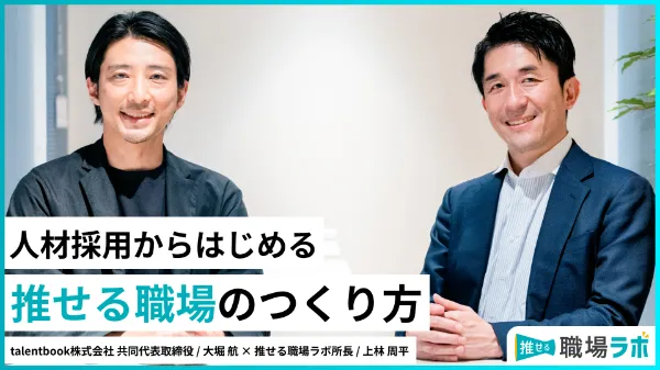 「働きやすく、働きがいがある職場=推せる職場」づくりをどのように進めていけばいいのか。働く人のストーリーを通じて企業の魅力を発信する「talentbook」を運営する大堀航さんと、推せる職場ラボ所長の上林周平に話を聞きました。